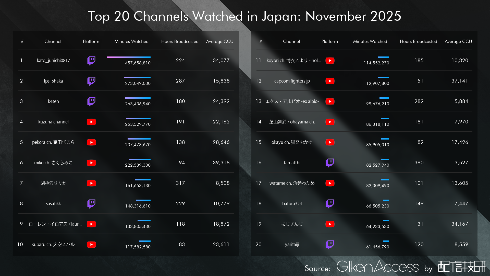 こちらは Giken Access から集計した、日本語で発信されているゲームカテゴリのライブ配信から、視聴時間順に上位20チャンネルを抜粋したものです。期間は2025年11月です。集計は載っているもの以外のプラットフォームも観測しています。