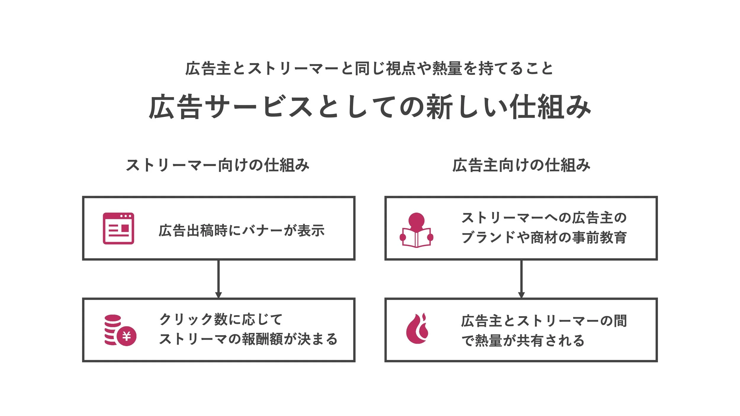 広告をライブ配信中に画面に表示されるバナーロールと、チャット欄に投稿されるクリック可能URLで実装しました。視聴者のクリック数に応じた成果報酬がストリーマーに還元されます。〈広告片思い〉やミスマッチを起こさず、伝える力が高いストリーマーに有利になるよう技術的に設計しました。