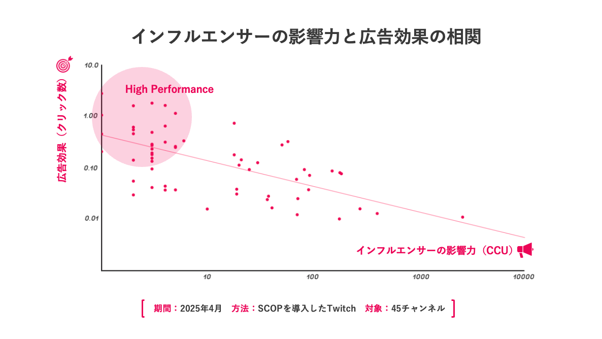 グラフからインフルエンサー規模と広告効果には負の相関があることが分かります。回帰直線では、インフルエンサー規模が1万人のチャンネルと比較して100人のストリーマーは視聴者1人あたりの広告クリック率が約100倍です。