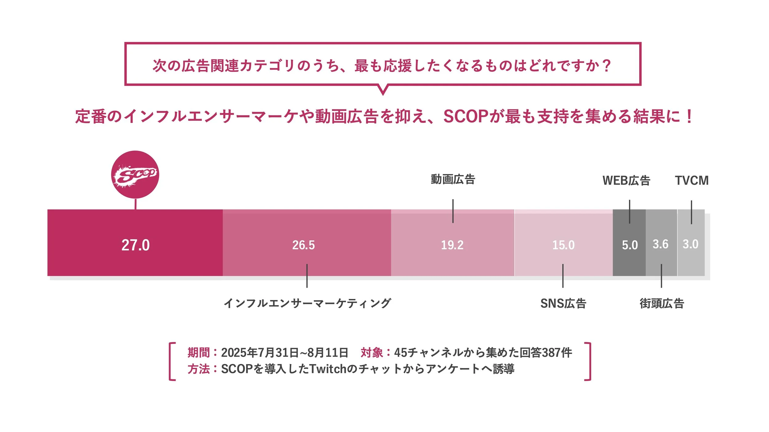 配信技研によるアンケート結果。SCOPはストリーマーの熱意もさることながら、視聴者からの熱意も高い結果に。