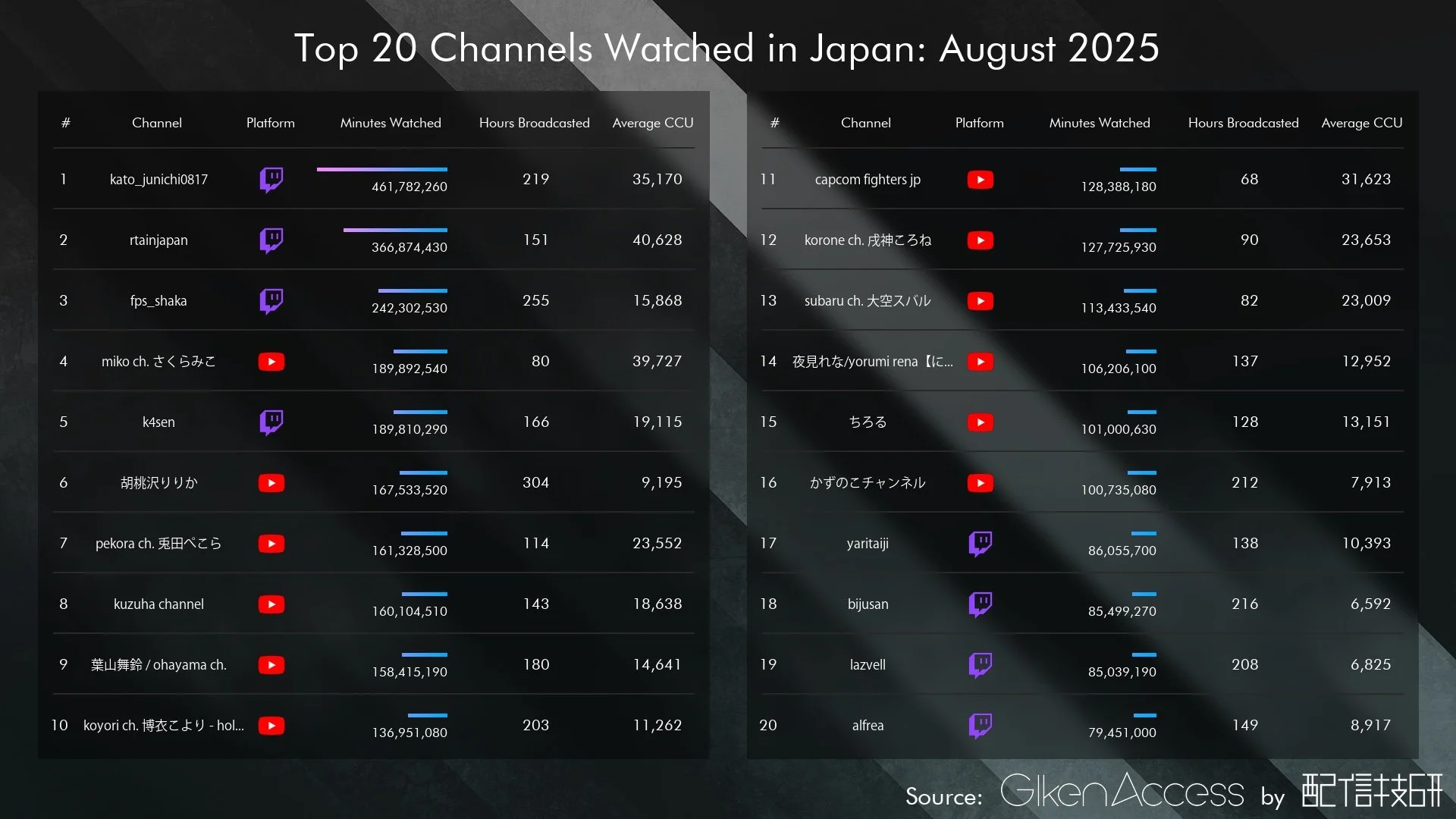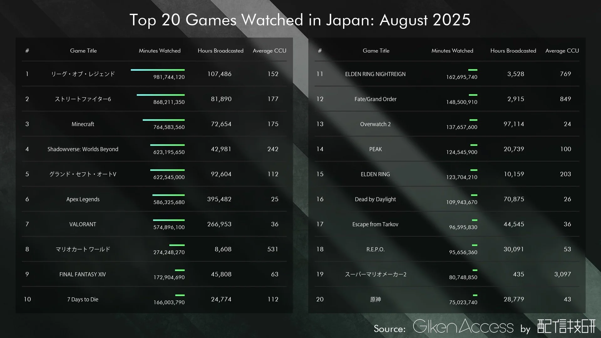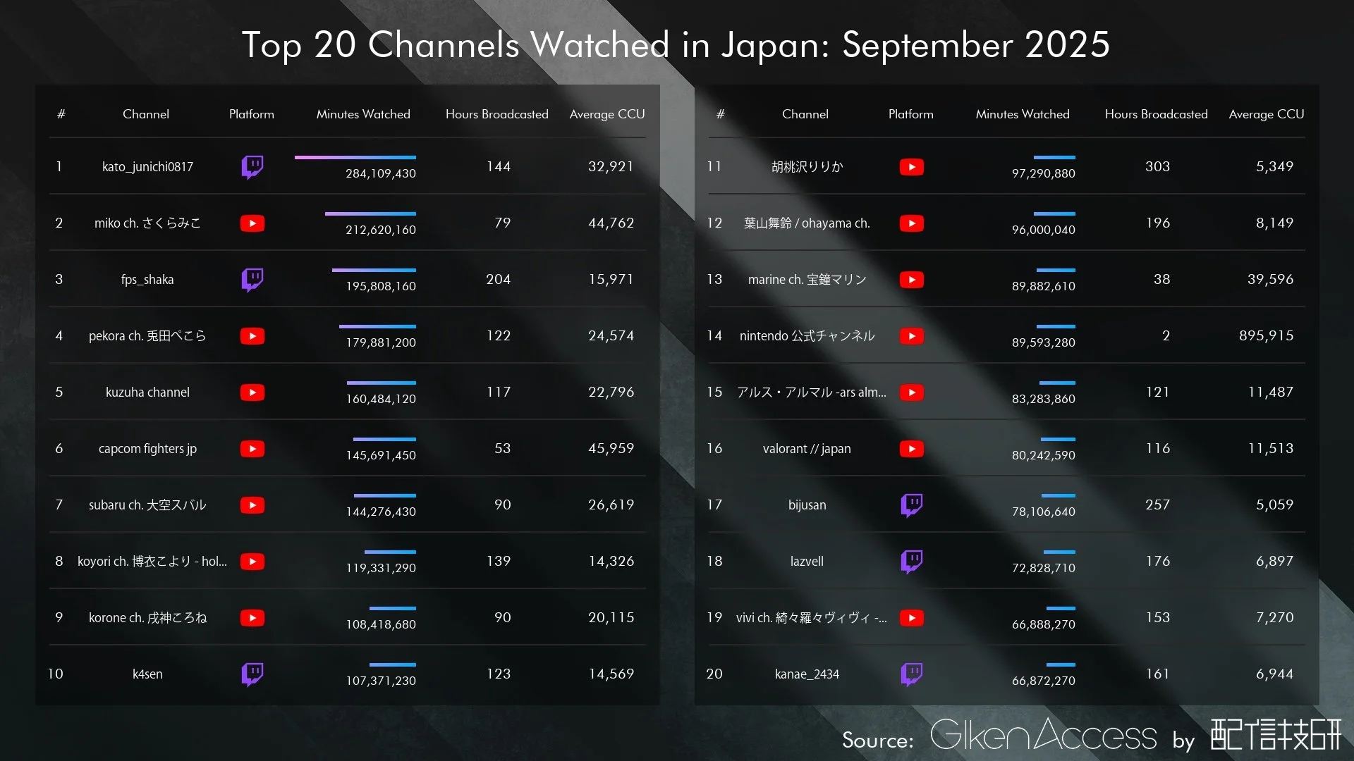 こちらは Giken Access から集計した、日本語で発信されているゲームカテゴリのライブ配信から、視聴時間順に上位20タイトルを抜粋したものです。期間は2025年9月です。